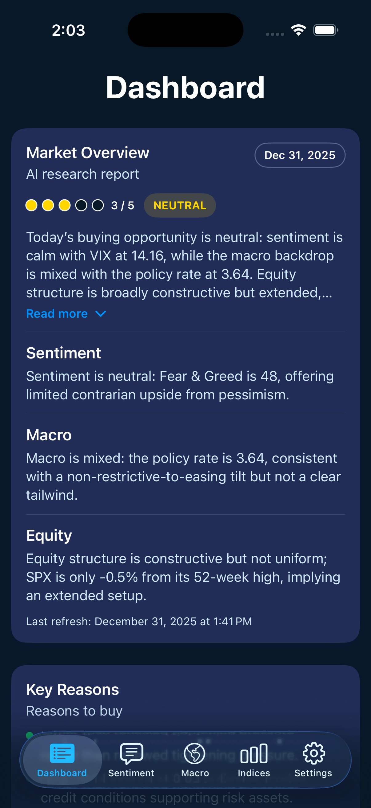 Market Compass combines sentiment, macro, and equity data into one single buying opportunity score. Designed to support disciplined decisions - especially during high volatility.